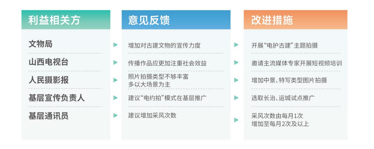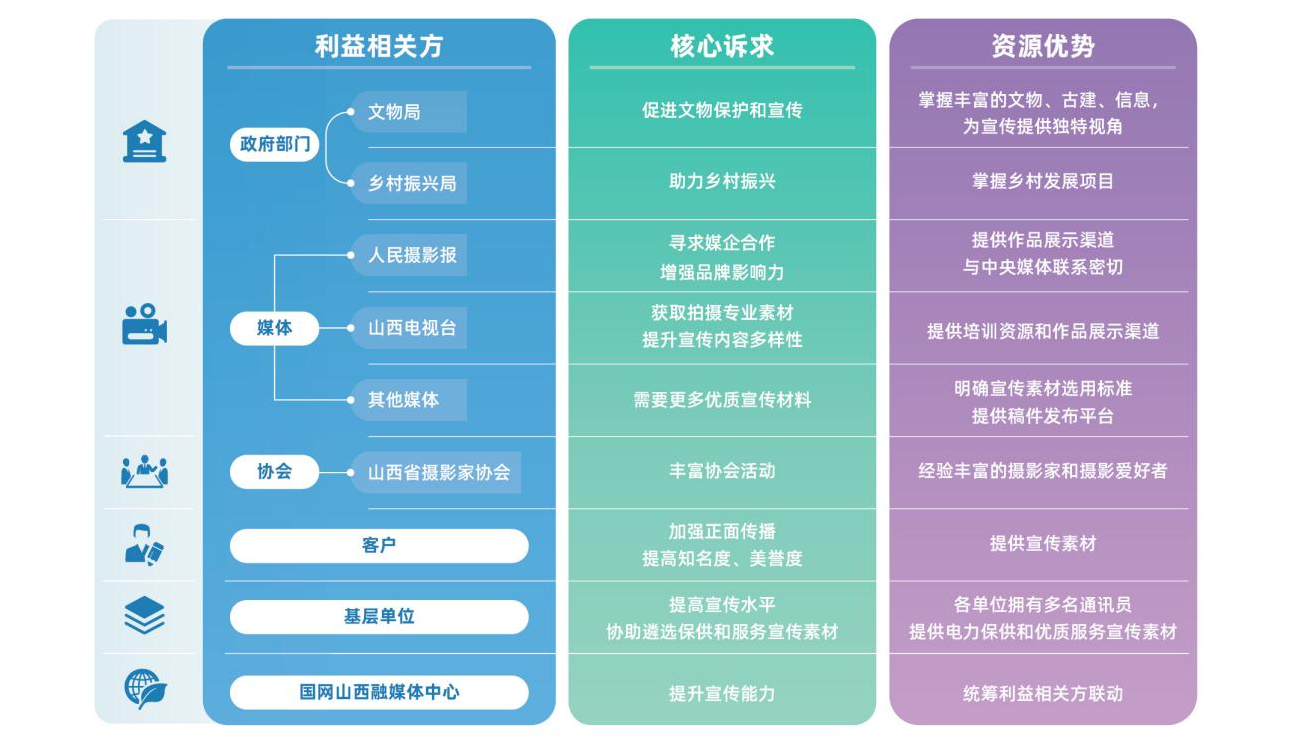 融媒體中心根植合作理念,將利益相關(guān)方拓展至政府部門(文物局、鄉(xiāng)村振興局等)、媒體(山西電視臺、人民攝影報等)、協(xié)會(山西省攝影家協(xié)會及市縣協(xié)會等)、基層單位、客戶(企業(yè)、人民群眾等),精準(zhǔn)識別分析各利益相關(guān)方的核心訴求與資源優(yōu)勢,搭建多方溝通平臺,確保溝通協(xié)作順暢,推動形成優(yōu)勢互補(bǔ)、資源共享的合作格局。