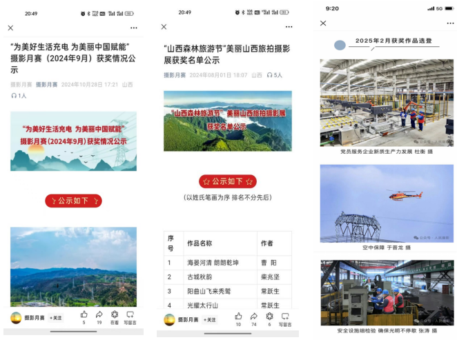 “電約拍”2.0項目實施以來,重點培養(yǎng)團(tuán)隊成員17名,輻射帶動80余名基層通訊員實戰(zhàn)能力提升,9名同志被山西攝影家協(xié)會吸收為會員。2024年,在人民日報、新華社、山西電視臺、山西日報、國家電網(wǎng)各類媒體平臺發(fā)表圖片594幅、視頻報道335條,分別同比增長430%、177%,宣傳績效得到有效提升,為企業(yè)高質(zhì)量發(fā)展?fàn)I造了良好的內(nèi)外部輿論環(huán)境?!半娂s拍”團(tuán)隊創(chuàng)作的《稻田喜事》《表里山河處處皆新色》等視頻作品獲得全國品牌故事大賽一等獎;短視頻“凌空一擊”全網(wǎng)點擊量超2億,評論、轉(zhuǎn)發(fā)次數(shù)過萬。人民攝影報先后以三個整版對“光影筑夢 點亮河?xùn)|”“與光同行 一路奮晉”“光影中的晉電力量”主題進(jìn)行圖文報道。