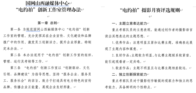 制定《“電約拍”創(chuàng)新工作室管理辦法》《2024年“師帶徒 青藍(lán)計劃”新聞采訪實訓(xùn)方案》《圖片資源管理系統(tǒng)管理辦法》《“電約拍”團(tuán)隊積分獎勵辦法》《爭創(chuàng)“七個最”宣傳成果工作方案》《“為美好生活充電 為美麗中國賦能”攝影月賽評選規(guī)則》《“電約拍”采風(fēng)承諾書》等相關(guān)制度,通過完善的管理機(jī)制和制度,推進(jìn)了項目規(guī)范化運(yùn)營、標(biāo)準(zhǔn)化管理。加強(qiáng)團(tuán)隊文化建設(shè),“電約拍——佳片有約”團(tuán)隊師徒8人,通過附加“葫蘆家族”情愫,打造出“記錄時代、匠心傳承”的團(tuán)隊文化。